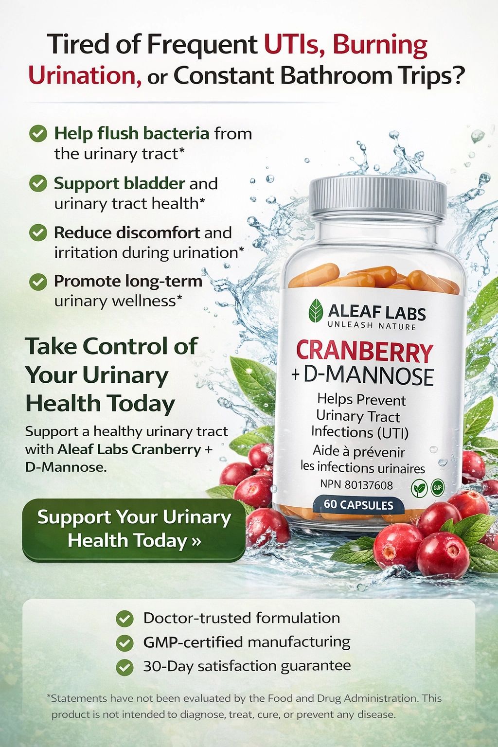 Support your urinary tract and bladder health with Aleaf Labs Cranberry + D-Mannose a powerful formula designed to promote long-term urinary wellness.